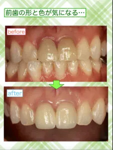 前歯の被せ物の形と色が気になることを主訴に来院された患者さんです♪