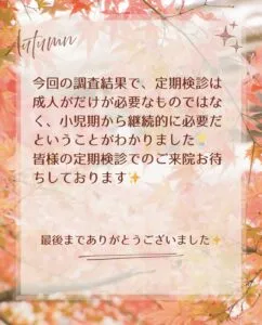 つまり、 「定期健診は子どもだけでなく、大人も一生続けて必要」 ということです。