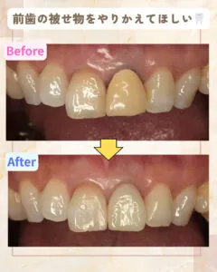40代女性前歯の被せ物をやりかえて欲しいという主訴で来院されました♪元々の被せ物が着色して目立っていたため、今回は自然な色と形を再現出来るセラミック治療を選択しました🦷